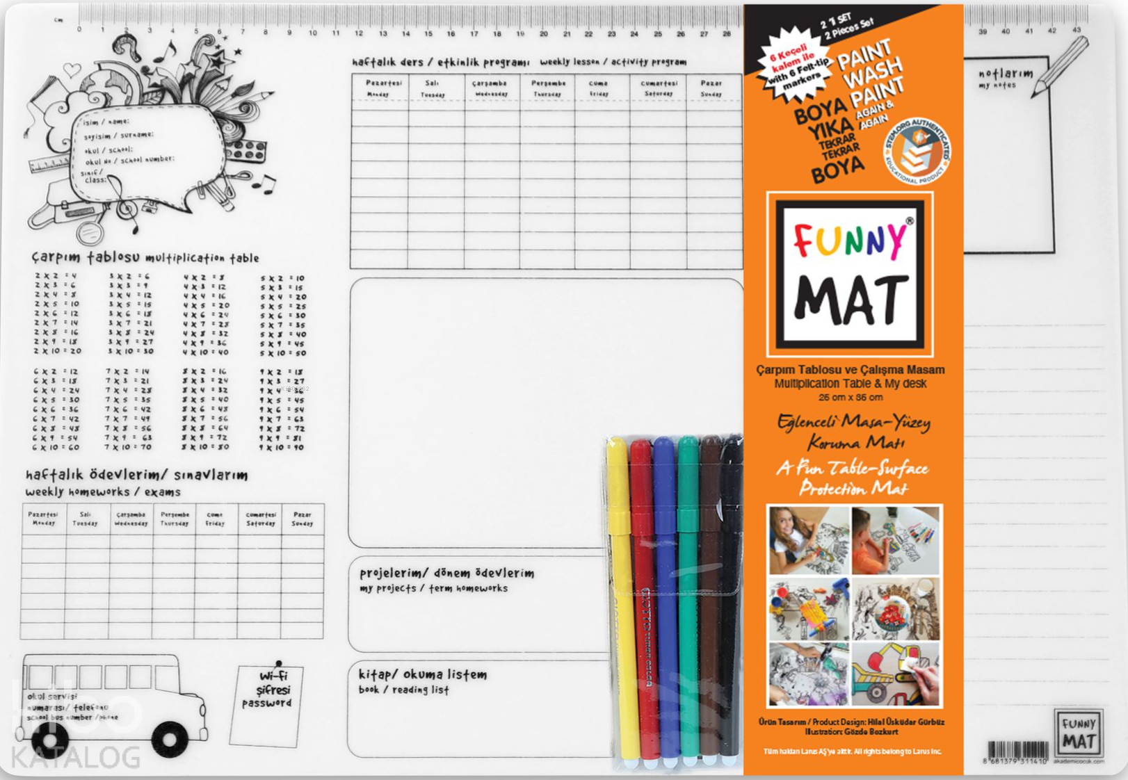Akademi Çocuk Funny Mat Çarpım Tablosu ve Çalışma Masam 2'li Paket 6'lı Keçeli Kalem Beyaz Serisi