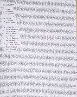 Realised as part of Arter’s Learning Programme, Arter Research Programme aims to support cultural producers working in the field of contemporary art in diversifying their research methods, perspectives and forms of expressions. The programme is shaped collaboratively by participants and programme facilitators with a process-oriented approach which prioritises self-organisation. The publication Re: [aap_2020], produced as part of the 2020–2021 edition of the Arter Research Programme, includes the ...